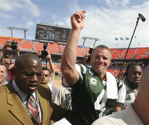 אז ברט פארב הגיע לניו יורק, וכבר במשחק הראשון, בפרו-פלייר במיאמי, הראה את זרוע הברזל שלו שהייתה כל כך חסרה לג'טס בשנים האחרונות. פארב שיגר שני לייזרים, אחד לג'ריקו קוצ'רי ל-56 יארד והשני לצ'אנסי סטאקי ל-22 יארד בדאון רביעי ו-13, משום שהבועט מייק נוג'נט נפצע והג'טס לא יכלו ללכת על שער שדה. תומאס ג'ונס רשם ברבע השלישי טאצ'דאון שהעלה ל-7:20 והדולפינס יכלו רק לצמק מאוחר יותר. פארב סיים עם 15 מ-22 ל-194 יארד ושני טאצ'דאונים. צ'אד פנינגטון סיים עם 26 מ-43 ל-252 יארד ושני טאצ'ים נגד האקסית שזרקה אותו עם חתימתו של פארב. 24 יארד בעשר נשיאות לריקי וויליאמס במיאמי, 101 יארד לג'ונס על הקרקע בג'טס.
