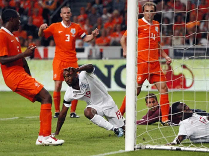 סטיבן ג'רארד הפצוע לא היה חלק מהסגל האנגלי למשחק, ובלעדיו היה נראה מרכז השדה האנגלי מעט פרוץ במחצית הראשונה. הולנד ניצלה זאת כדי לפתוח מצוין, וכבר בדקה העשירית טעות איומה של ריו פרדיננד אפשרה לדרק קויט לעקוף את רוברט גרין כדי לקבוע 0:1 כתום. שתי הקבוצות הגיעו למצבים רבים, ובדקה ה-37 שוב הראתה ההגנה האנגלית את חולשתה הרבה, כשטעות נוספת, הפעם של גארת' בארי, אפשרה לרפאל ואן דר וארט לקבוע 0:2, ולהשאיר את האנגלים בהלם.