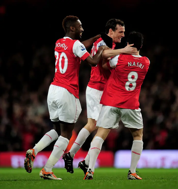 תיאו וולקוט הגיע להזדמנות גדולה כבר בדקה הראשונה. ג'ק ווילשר התחיל במהלך על סף הרחבה, העביר לססק פברגאס, שהכניס מסירת עומק מצוינת לחלוץ האנגלי הצעיר, שנותר לבד מול אסמיר בגוביץ' ובעט חזק לקורה. בדקה השמינית הצליחה ארסנל לעלות ל-0:1 כשניקלאס בנדטנר הוריד על החזה ויישר לסבסטיאן סקילאצ'י והבלם נגח מקרוב את השער הראשון שלו בליגה העונה. דווקא ג'ון קארו הגיע להזדמנות די מסוכנת בדקה ה-35, אך וויצ'ק שצ'סני הצליח להדוף ולהציל את הקבוצה של ארסן ונגר מתיקו, שהיה פוגע בשאיפות האליפות שלה.